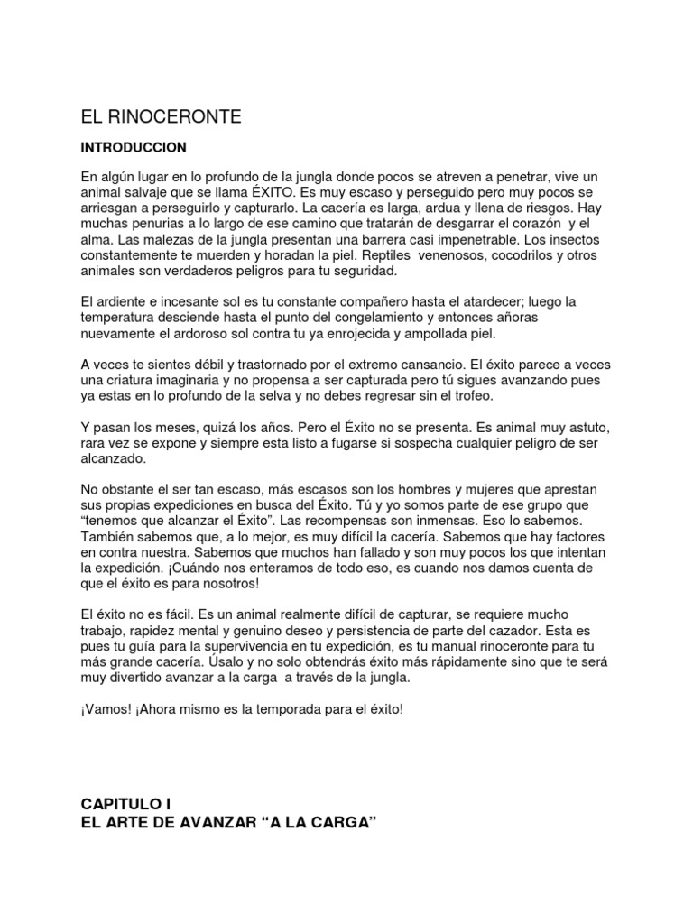 Resumen del libro el rinoceronte este resumen es del libro el rinoceronte cuenta con 15 capitulos que basicamente se trata de una guia practica para alcanzar el éxito.el personaje principal es el rinoceronte y habla básicamente de que somos nosotros los rinocerontes. Gira en redondo y dispara su pieza de artillería. Otros decían que nos debíamos vestir para el éxito. Libros para lideres + resumen semanal por suscripción + www.gomezespejel.com Resumen del libro el rinoceronte el libro gira en torno a el éxito, de un animal salvaje que vive en el interior de la jungla. Una de las claves de este libro es hacer que el lector tenga la confianza y fe en sí mismo de que puede alcanzar los objetivos propuestos, pero ante todo la persona tiene que tener bien definidos sus objetivos y plantearlos de manera prioritaria y no descansar hasta lograr cada uno de ellos. Resumen capítulos el rinoceronte 2. Huamani vega, angel ronald comentario del libro (individual) el rinoceronte, scott alexander es uno de los libros más pequeños que leí, pero es de los que más aprecio en mi librería, nos muestra ideas concretas. Über 7 millionen englischsprachige bücher. No hay que esperar el desarrollo, desde la introducción te mantiene en el borde del asiento esperando lo que sigue. Comucaciones • 18 de marzo de 2014 • 1.791 palabras (8 páginas). Verdadero y falso libro otto el rinoceronte. Queda demostrado que no existe una edad definitiva para ser éexitoso.
